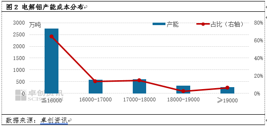 本期全国电解铝亏损产能占比较上月变动不大。据卓创资讯统计,本期电解铝产能成本在16000元/吨以下的产能规模为2746.2万吨,占比64.04%;16000-17000元/吨产能规模为584万吨,占比13.62%;17000-18000元/吨产能规模为588.7万吨,占比14.43%;18000-19000元/吨产能规模为326.2万吨,占比2.32%;产能成本大于19000元/吨的产能规模270万吨,占比6.30%。