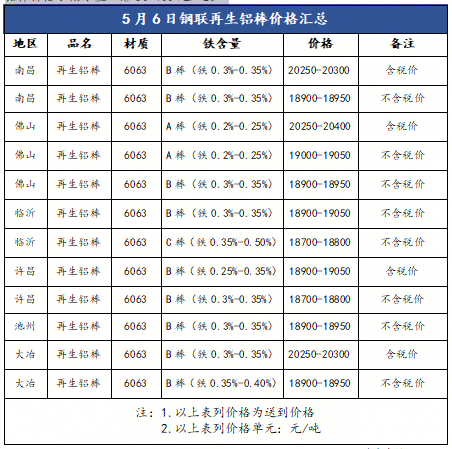 5月6日A00铝锭现货价华东19860,跌200;华南19780,跌200;中原19780,跌210(单位:元/吨)。废铝供应更为紧张,受成本端支持,今日再生铝棒价格小幅跟盘回落50-100元/吨。