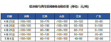 铝价随盘下跌,铝水棒加工费初始集体上抬,挺价节奏突显,途中期铝反复波动,持货商逐步再度开启下调操作,加工费在370-500元/吨区间。废铝原料偏紧,再生铝棒生产成本不减,受成本端支撑,铝水棒与B棒价差依旧倒挂在-100~100元/吨,再生铝棒替代性一般。