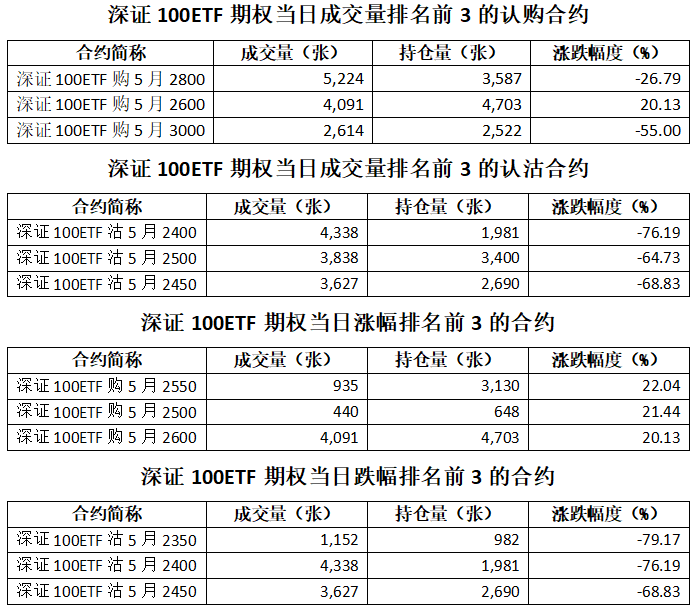深证100ETF期权总成交面额14.19亿元,增加78.86%,期现成交比为0.01,权利金成交额0.12亿元;期权总成交量54,158张,增加77.55%,其中认购期权成交量26,779张,认沽期权成交量27,379张,认沽认购成交比率为1.02(上一交易日认沽认购成交比率为1.04)。