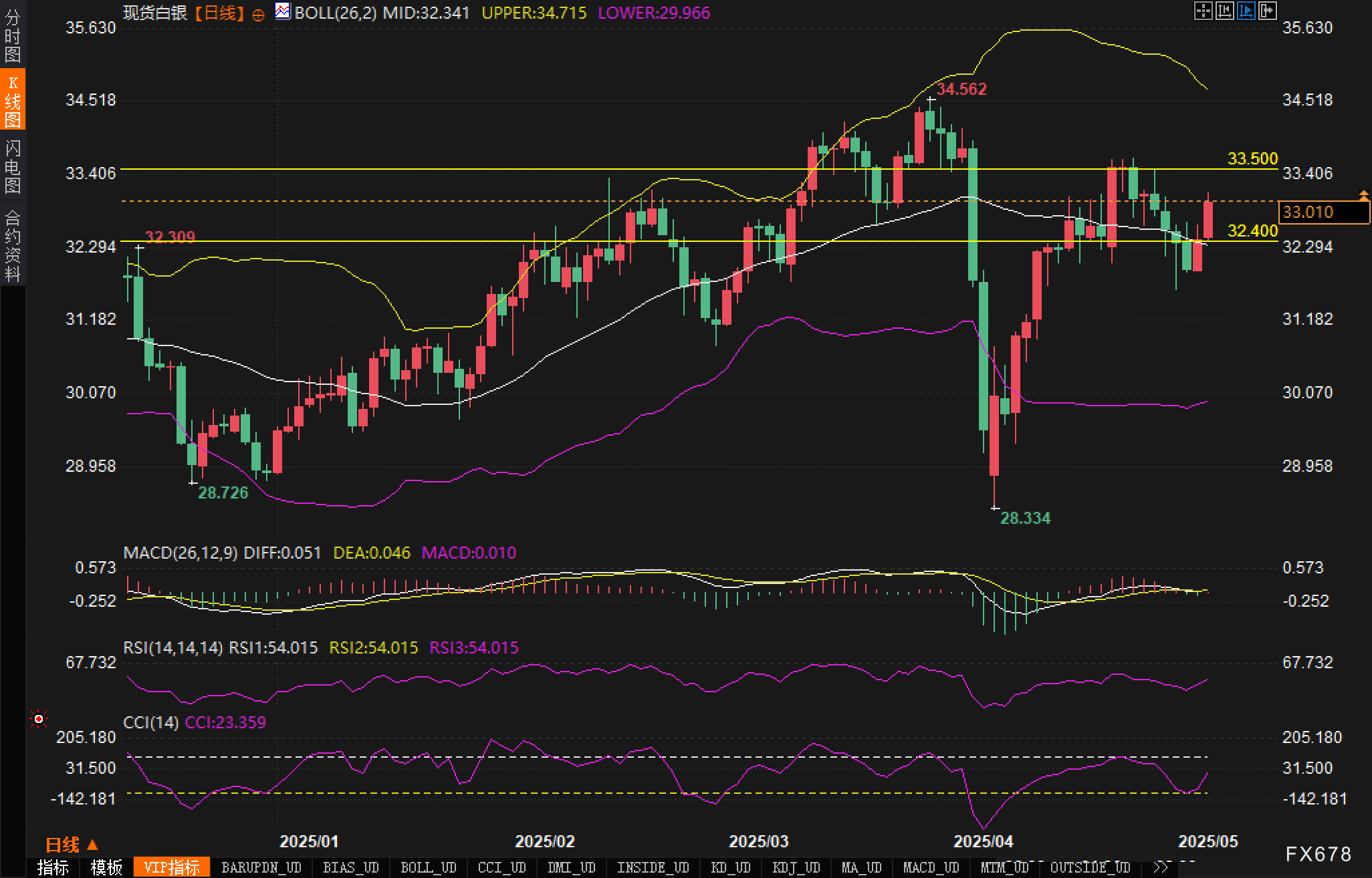 白银日线图显示,价格自28.334的低点大幅反弹,目前正在测试关键阻力位33.500美元。布林带指标显示,上轨位于34.715,下轨位于29.966,中轨位于32.341,当前价格处于布林带上方区域,表明市场整体处于上行通道中。