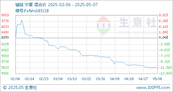 5月7日,生意社锰硅基准价为5610.00元/吨,与本月初(5640.00元/吨)相比,下降了-0.53%。