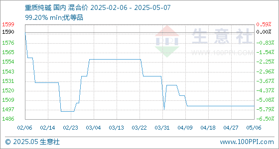 5月7日,生意社重质纯碱基准价为1502.50元/吨,与本月初持平。