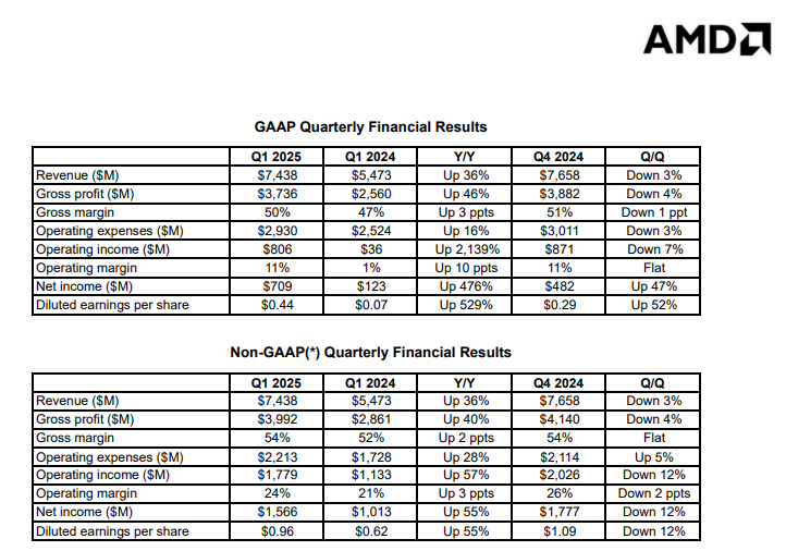 AMD2025年第一季度营业利润同比增长2139%:数据中心业务营收增长57%,客户端处理器增长68%