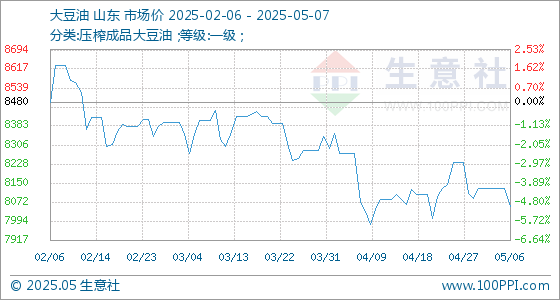 5月7日,生意社大豆油基准价为8056.00元/吨,与本月初(8126.00元/吨)相比,下降了-0.86%。