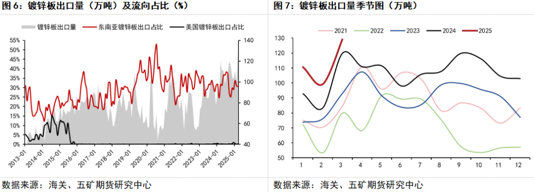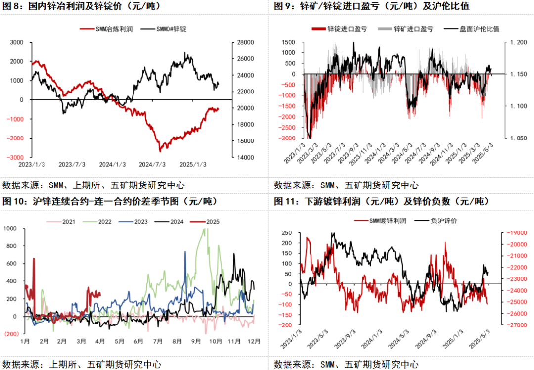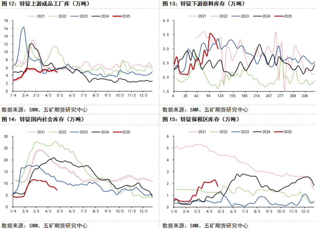 供应端,锌矿处于过剩周期中且该过剩周期仍未结束。通过对过往几轮锌矿过剩周期的复盘,我们可以发现即便在锌矿过剩周期结束后(TC拐点),锌价还会维持一小段时间的下跌趋势;需求端,地产基建表现乏力,锌锭内需难有增量。在关税战的背景下,美国对东南亚地区征收关税,中国镀锌出口转口贸易受限,锌锭出口消费下行。进入五月后,锌锭金三银四传统旺季结束。综合供需来看,锌产业预期视角呈现供需双弱格局。