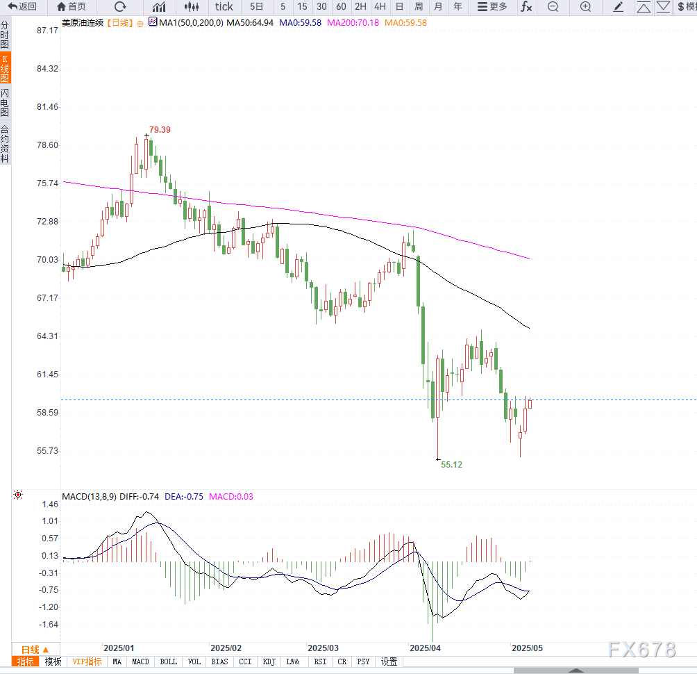 MACD指标显示快线穿越慢线,形成金叉,强化看涨信号。若价格能突破62美元的次高阻力位,可能进一步上探65美元的年内高点。然而,若全球贸易情绪缓和不及预期或OPEC+增产超预期,价格可能回测58美元的支撑位。