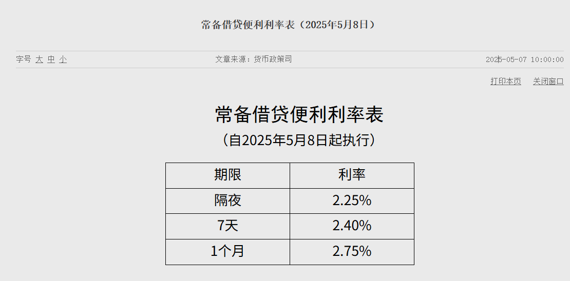 上证报中国证券网讯 5月7日消息,中国人民银行公布最新常备借贷便利利率表,自2025年5月8日起,隔夜、7天、1个月常备借贷便利利率分别调整为2.25%、2.40%、2.75%,较此前下调10个基点。