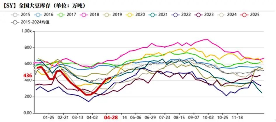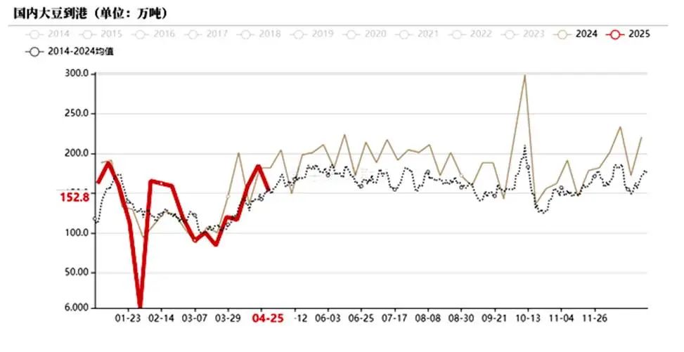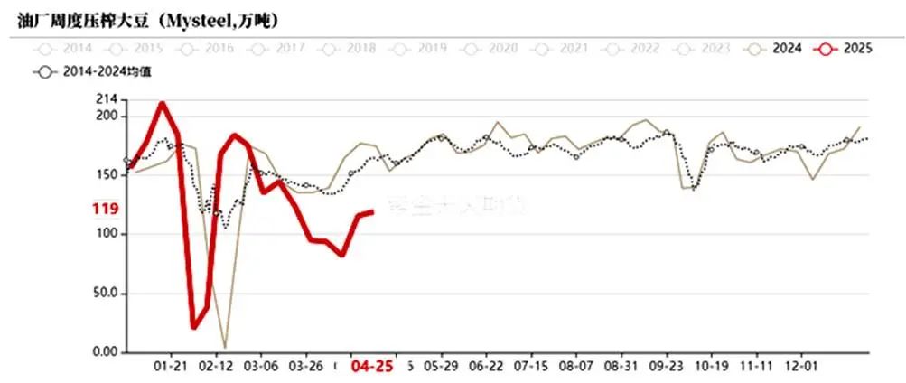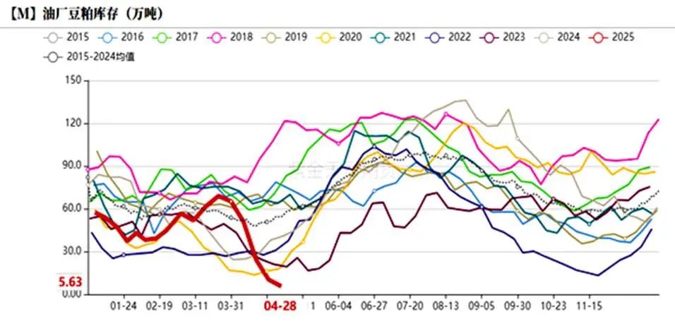 因为榨利差以及下游采购远月豆粕基差不积极,春节前国内采购1月船期进口大豆进度慢,叠加巴西收割延迟,造成国内3月进口大豆到港量是近10年同期最低水平,较2024年同期减少300万吨左右,导致3月底油厂大豆库存较低。