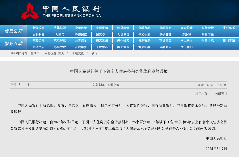 本报讯 (记者韩昱)中国人民银行5月7日发布《中国人民银行关于下调个人住房公积金贷款利率的通知》(以下简称《通知》)。《通知》称,中国人民银行决定,自2025年5月8日起,下调个人住房公积金贷款利率0.25个百分点,5年以下(含5年)和5年以上首套个人住房公积金贷款利率分别调整为2.1%和2.6%,5年以下(含5年)和5年以上第二套个人住房公积金贷款利率分别调整为不低于2.525%和3.075%。