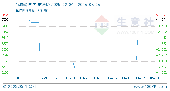5月5日,生意社石油醚基准价为8416.67元/吨,与本月初持平。
