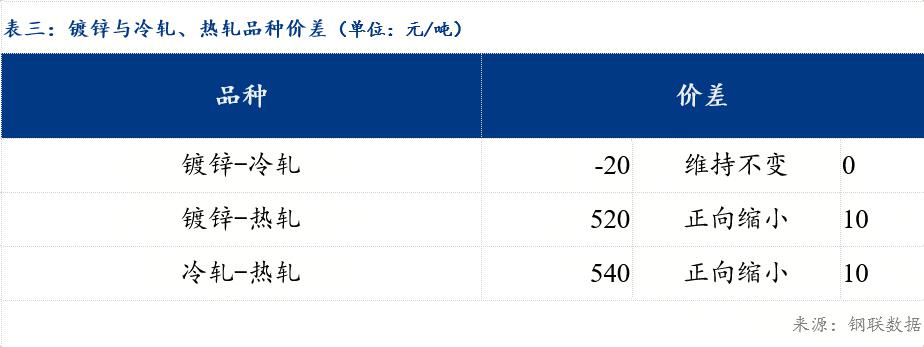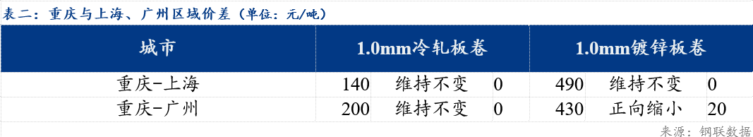 重庆、上海地区冷轧板卷区域价差维持不变;重庆、广州冷轧板卷区域价差维持不变 。重庆、上海镀锌板卷区域价差维持不变;重庆、广州镀锌板卷区域价差缩小20元/吨。镀锌、冷轧品种价差维持不变;镀锌、热轧品种价差缩小10元/吨 ;冷轧、热轧品种价差缩小10元/吨 。