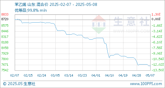 5月8日生意社苯乙烯基准价为7650.00元/吨