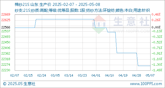 5月8日,生意社棉纱21S基准价为22266.67元/吨,与本月初持平。