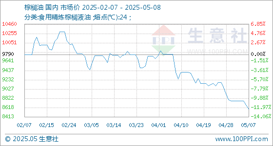 5月8日生意社棕榈油基准价为8584.00元/吨