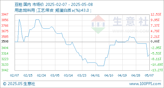 5月8日,生意社豆粕基准价为3302.00元/吨,与本月初(3476.67元/吨)相比,下降了-5.02%。