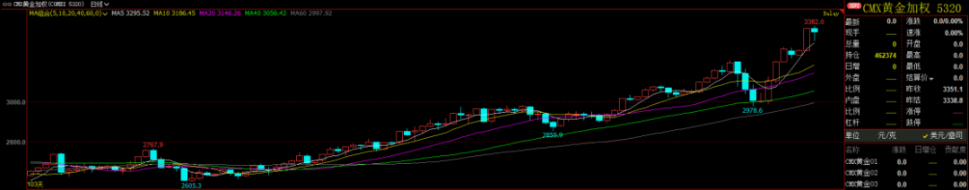 周四comex黄金期货06主力合约高位震荡,开盘价3357.5美元/盎司,最高3371.9美元/盎司,最低3296.4美元/盎司,收盘3341.3美元/盎司,全天下跌16.4美元/盎司,跌幅0.49%。