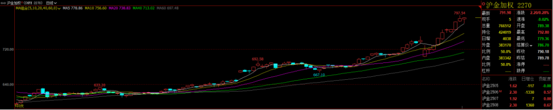沪金期货2506主力合约周五探底回升强势走高,开盘价788.1元/克,最高价791.18元/克,最低价778.14元/克,最终收盘在791.2元/克,全天上涨1.8元/克,涨幅0.23%。周五沪金探底回升非常强势。