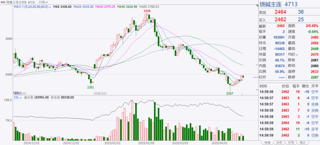 期货端:今日烧碱主力合约震荡整理,市场重心开始转向2509合约。主力合约收盘价2462元/吨,上涨2元/吨,涨幅为0.08%。