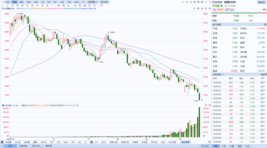 早盘开盘后,玻璃期货主力合约迅速下跌超3%,午后跌幅进一步扩大至4%以上,市场空头力量占据主导。