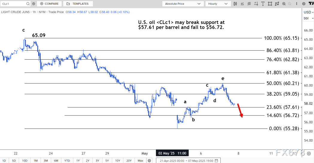 汇通财经APP讯——周四(5月8日)亚洲时段,美原油小幅反弹,目前交投于58.50美元/桶附近。路透技术分析师指出,美国原油可能跌破每桶 57.61 美元的支撑位,跌至 56.72 美元。