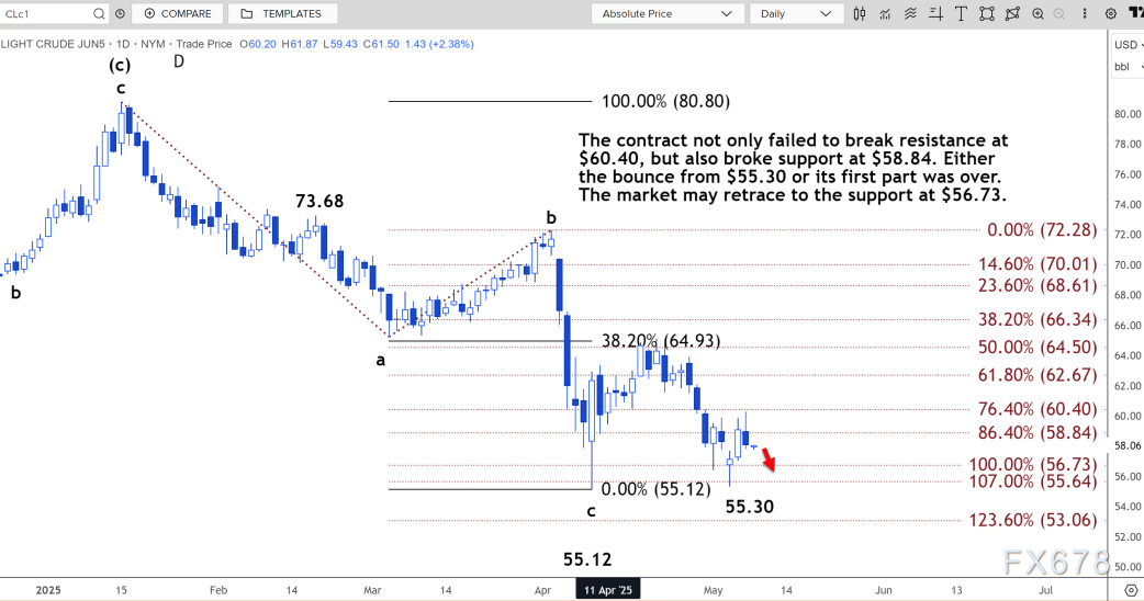 从55.30美元开始的反弹,或者说其第一阶段的反弹已经结束。市场可能回撤至56.73美元的支撑位。