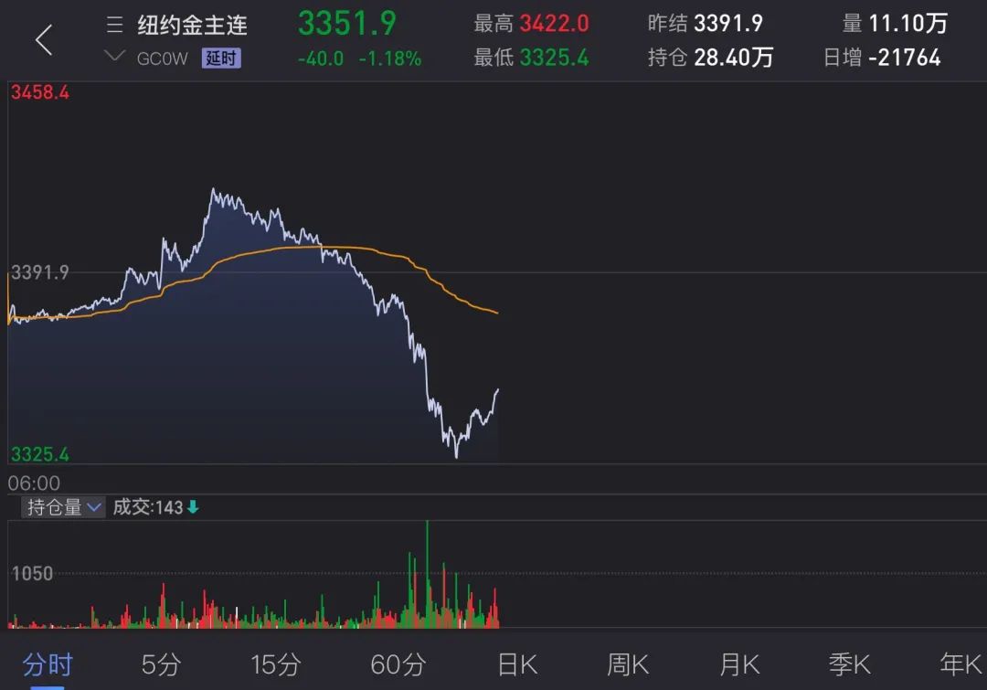 国际黄金现货、COMEX黄金期货均较日内高点回调近100美元。COMEX黄金最新报3351.9美元/盎司,跌幅为1.18%。