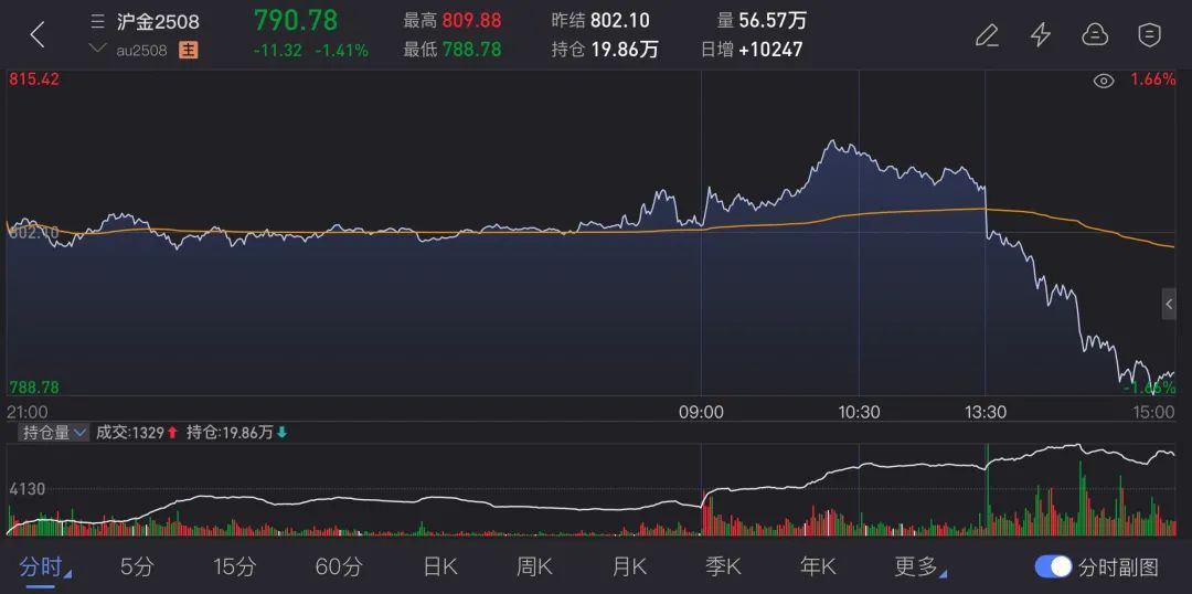 国内金价也随之跳水,沪金2508合约日内从高点回调超20元,最新报收790.78元/克,跌幅为1.41%。