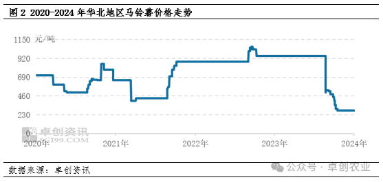 西北、华北产区部分大厂2023年马铃薯淀粉货源待售,在2024年春季、夏季粉低价冲击下,2023年淀粉销量减少,据卓创资讯统计,2023年马铃薯淀粉库存量约5万-6万吨,市场供应压力仍存。