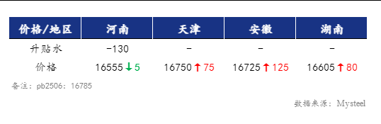 5月8日全国市场1#铅锭价格报16625元/吨,较上一交易日上涨75元/吨。炼企现货市场报价方面,其中河南济源市场持货商维持对沪铅2506合约转报贴水100-130元/吨出厂,湖南市场炼企对铅现货均价升水不变,炼厂报贴水20-50元/吨出厂,安徽市场炼企对铅现货均价报升水50元/吨出厂。