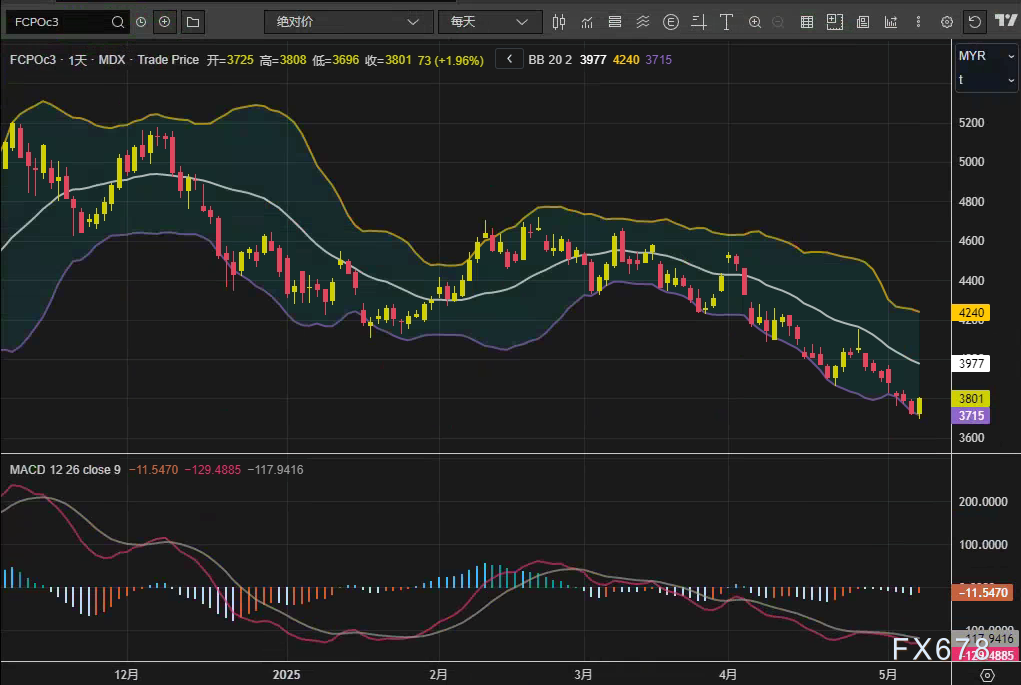 从技术面来看,棕榈油日K线图显示价格在布林带下轨附近获得支撑后反弹。布林带(20,2)上轨位于4240林吉特/吨,中轨为3977林吉特/吨,下轨为3715林吉特/吨。当前价格3801林吉特/吨,接近布林带下轨,反映市场在超卖区域的企稳迹象。然而,价格仍低于中轨,短期趋势偏弱。