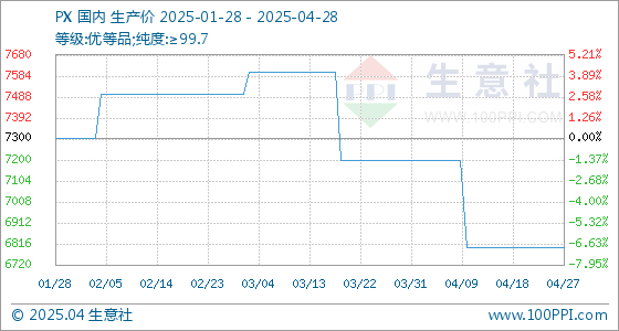 4月28日,生意社PX基准价为6800.00元/吨,与本月初(7200.00元/吨)相比,下降了-5.56%。