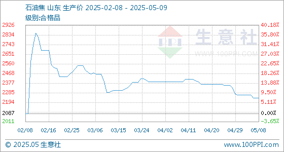 5月9日,生意社石油焦基准价为2237.50元/吨,与本月初(2262.50元/吨)相比,下降了-1.10%。