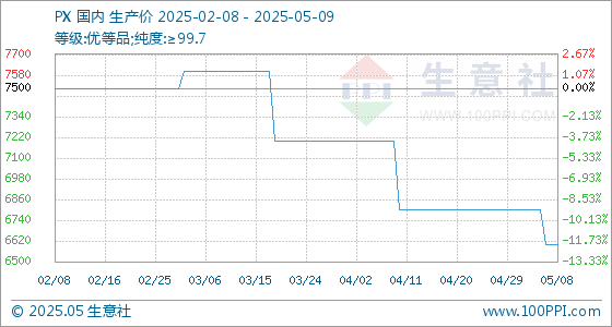 5月9日,生意社PX基准价为6600.00元/吨,与本月初(6800.00元/吨)相比,下降了-2.94%。