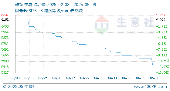 5月9日,生意社硅铁基准价为5402.86元/吨,与本月初(5548.57元/吨)相比,下降了-2.63%。