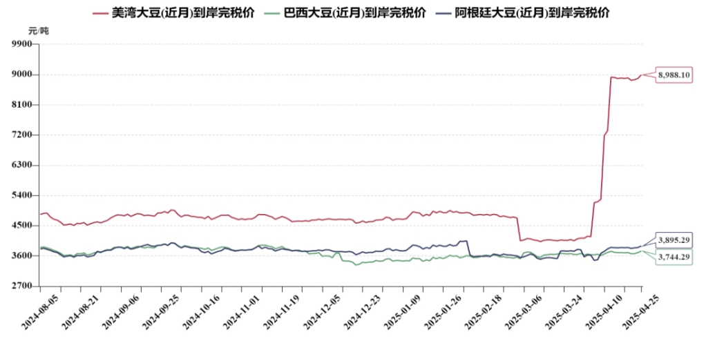 近期巴西、阿根廷产地的进口大豆近月到岸完税价整体处于稳中偏强走势,而美湾大豆近月到岸完税价报8988.10元/吨,价格稍微上涨,但该产地大豆已不具有成本优势。