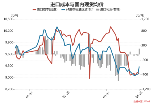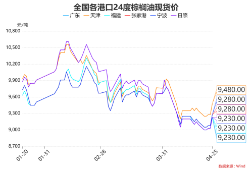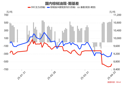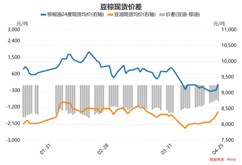 4月25日,各港口棕榈油现货报9230-9480元/吨,较前一日价格整体涨200元/吨;进口利润197.5元/吨,基差592.33元/吨;豆棕现货价差-868.86元/吨。