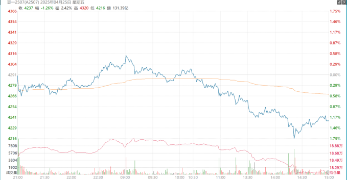 2025年4月25日,大商所豆一期货主力连续合约今日反弹受阻,价格冲高回落。当日开盘价4290元/吨,最高价4320元/吨,最低价4216元/吨,收盘价