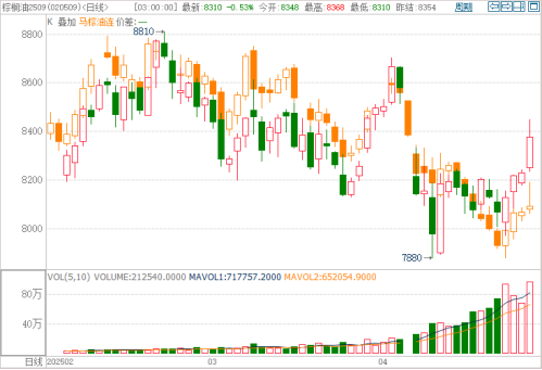连棕P2509报收8376元/吨,较结算价涨2%,成交96.34万手,持仓41.45万手。