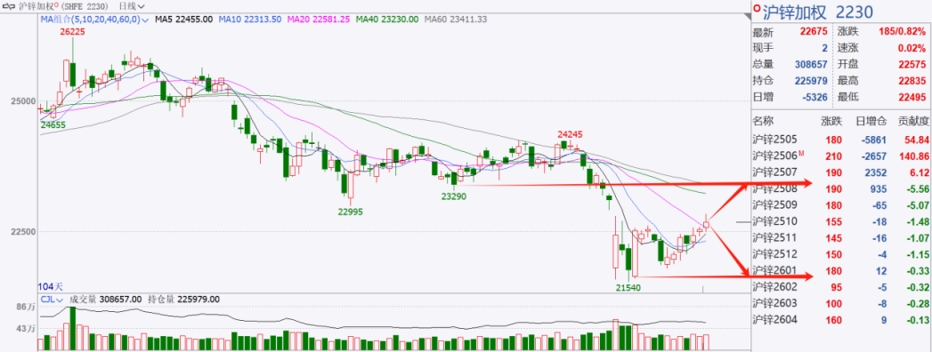 期货盘面,沪锌主力合约开盘后震荡上行,收盘价22750元/吨,结算价22745元/吨,较前日上涨210元/吨。