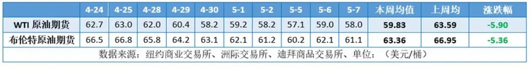本周期(4.24-5.7),原油整体呈现震荡下行的走势,周均价环比下跌。
