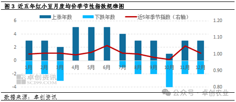 从近5年红小豆月度均价季节性指数规律图可见,5月份红小豆均价月环比上涨,预计今年符合季节性波动特点。