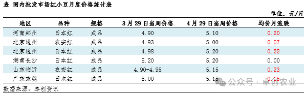据卓创资讯统计,截至4月29日销区批发市场贸易商红小豆出货价格月环比上涨,主因产区红小豆价格上涨,销区市场采购成本上升带动。卓创资讯监测的销区市场中,河南郑州、北京通州、山东临沂、广东东莞销区红小豆出货价格较上月底价格上涨0.07-0.23元/斤。湖南长沙销区红小豆出货价格较上月底价格稳定。本月,销区市场按需采购,红小豆出货价格受到采购成本影响