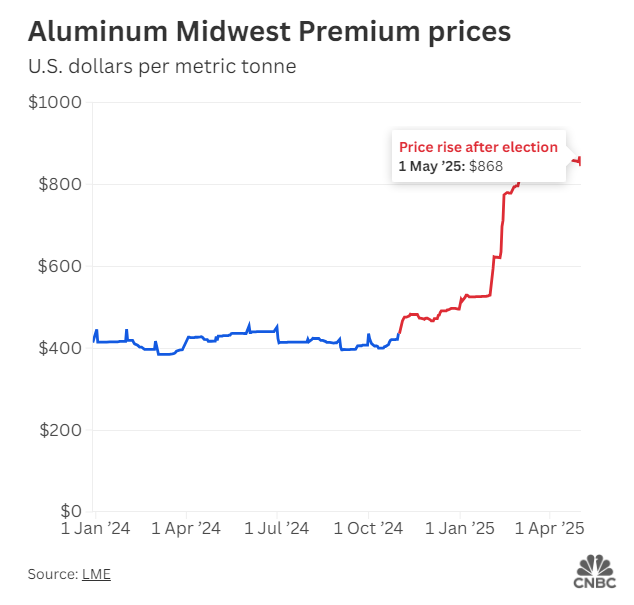 25%的铝关税对实体市场的影响尤为显著。虽然伦敦金属交易所提供基准铝价,但实际采购成本还需计入区域交货溢价,而当前溢价主要反映的正是关税成本。
