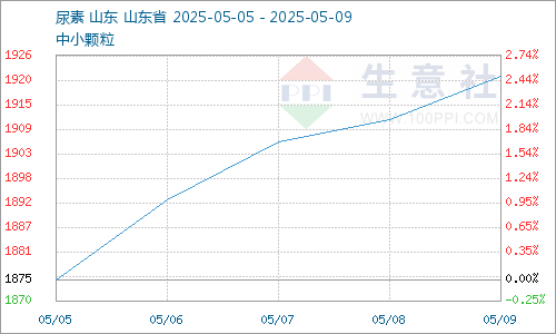 据生意社商品行情分析系统,截止5月9日,国内尿素市场参考均价为1921元/吨,较5月5日市场参考均价1875元/吨,国内尿素市场价格上涨幅度为2.49%。