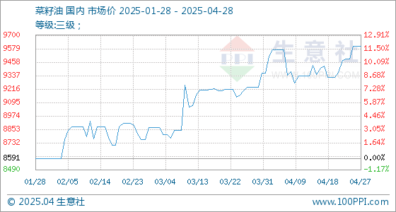4月28日,生意社菜籽油基准价为9600.00元/吨,与本月初(9361.67元/吨)相比,上涨了2.55%。