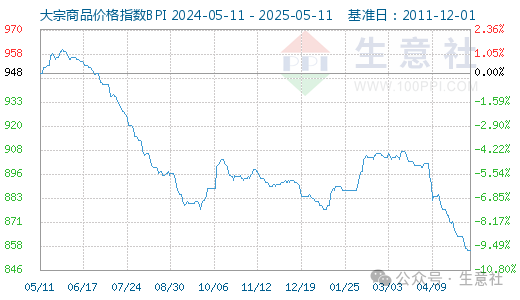 5月11日大宗商品价格指数BPI为856点,与昨日持平,较周期内最高点1343点(2021-10-19)下降了36.26%29.70%