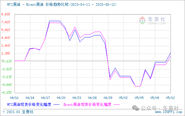 国际原油市场,五一期间大幅走低,主要原因是欧佩克+增加产量超预期,该消息利空国际油价。五一后随着美国加大对某国的石油限制问题,以及国际地缘冲突,中美有意进行商谈等问题影响,国际油价走势上涨。截止5月9日,美国WTI原油期货主力合约结算价报61.02美元/桶,布伦特原油期货主力合约结算价报63.91美元/桶。