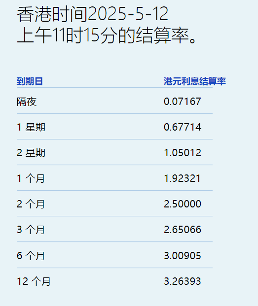 5月12日,港元拆息亦几乎全线向下,其中,隔夜息微跌至0.07167%,为2022年6月13日以来最低,而与楼按相关的一个月拆息连跌五天,报1.92321%,为2022年9月7日后最低。反映银行资金成本的三个月拆息回落13基点至2.65066%,为2022年8月30日后最低,六个月期报3.01167,见2022年8月9日以来最低,但一年期拆息结束四连跌,升至3.26393%。