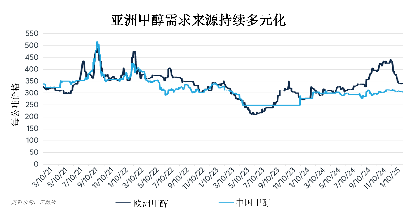 2024年,欧洲甲醇期货即月合约价格在270至440欧元区间波动,而2025年初至2月期间的价格区间为330至440欧元。亚洲市场方面,截至2025年2月的过去12个月期间,即月合约期货结算价波动区间为每公吨280至325美元。芝商所数据显示,欧洲与中国甲醇价差约为每公吨35美元,创下自2024年8月以来的最低水平。
